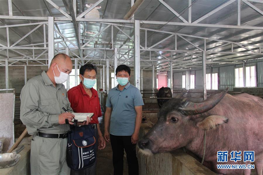6月12日,魏碧涛(左)在湖北省咸宁赤壁市官田村了解水牛养殖情况。新华社发(毕红续 摄)