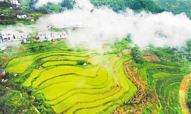 8月29日,万盛经开区黑山镇天星村晨雾缭绕,村民正在田里收割水稻。