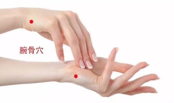 腕骨穴:位于手背尺侧,第五掌骨与骨豌豆骨之间凹陷处;