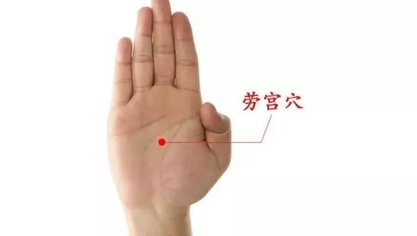 劳宫穴:握掌时取穴,中指指尖对掌心处即是;