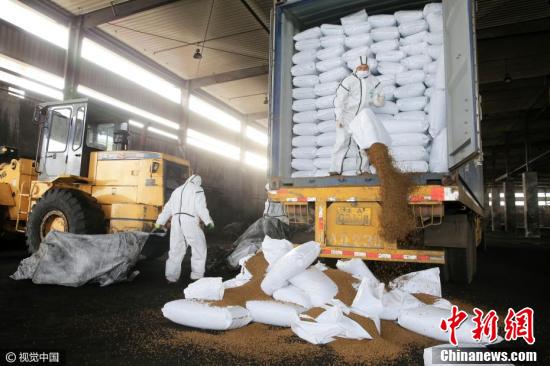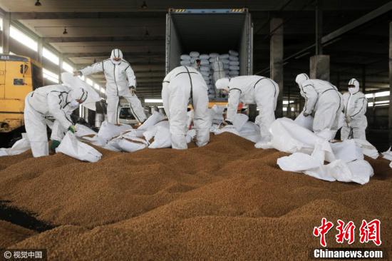 2017年2月20日,在天津检验检疫局工作人员的监督下,企业人员对三批来自禽流感疫区并含禽源性成分的宠物饲料进行了集中销毁处理。
