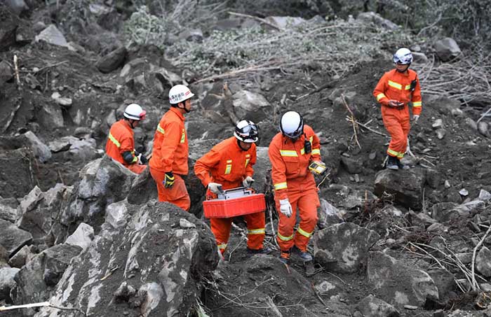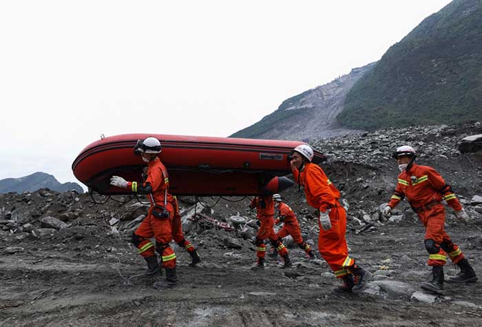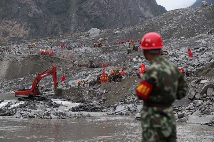 6月24日5时45分,四川省阿坝藏族羌族自治州茂县叠溪镇新磨村新村组富贵山山体突发高位垮塌。据专家初步认定此次灾害塌方量巨大,滑坡体最大落差约1600米,平面滑动距离2500米至3000米。据最新消息,灾害已造成93人失联,3人被救出住院。 新华社记者薛玉斌 摄
