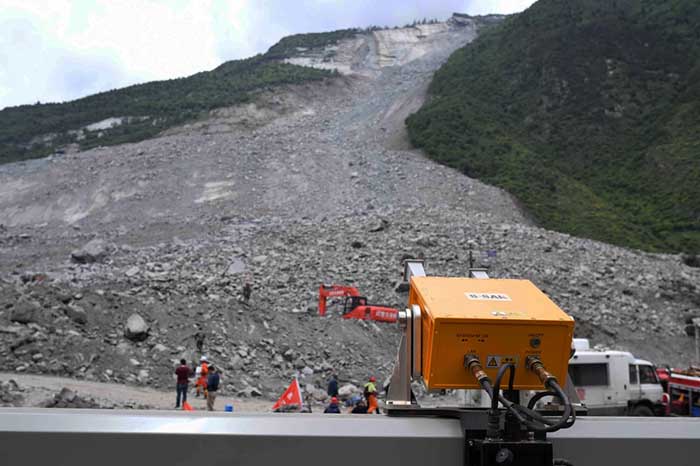 6月25日,能监测山体滑坡的边坡雷达在茂县山体垮塌现场监测滑坡体的变形情况。 新华社记者薛玉斌 摄