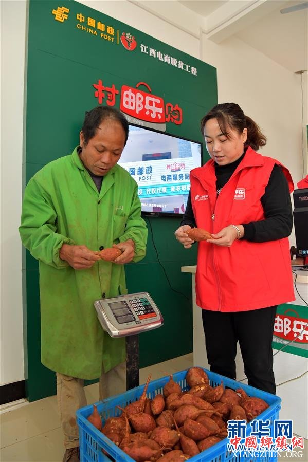 11月14日,在江西省余江县平定乡洪桥村,村级电商服务站的工作人员在查看村里收获的红薯,准备拍照分拣,上网销售。