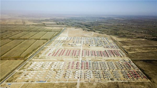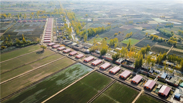 这是在新疆策勒县拍摄的一处异地扶贫搬迁试验区。试验区配套的畜牧棚圈、节水灌溉系统、经济林等可为贫困农牧民的脱贫致富提供保障(11月2日摄)。
