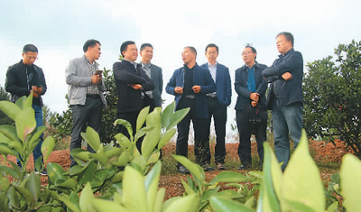 新宁崀山果业有限公司陈锡祥董事长(右四)推广崀山脐橙的绿色无公害种植