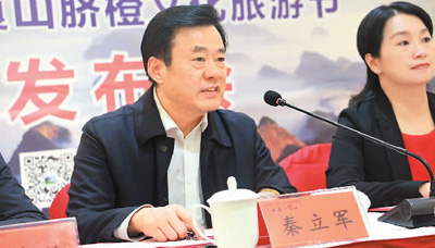 图为邵阳市人大常委会副主任、新宁县委书记秦立军在崀山脐橙文化旅游节新闻发布会上。潘梁平 摄