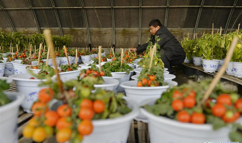 12月19日,巨鹿县南哈口村农民郭建强在大棚里管理樱桃西红柿盆景。近年来,河北省巨鹿县大力推进现代高效设施农业建设,鼓励农民走规模化种植道路。目前,这个县发展设施农业种植面积3万多亩,带动1万多贫困群众实现增收。新华社记者牟宇摄