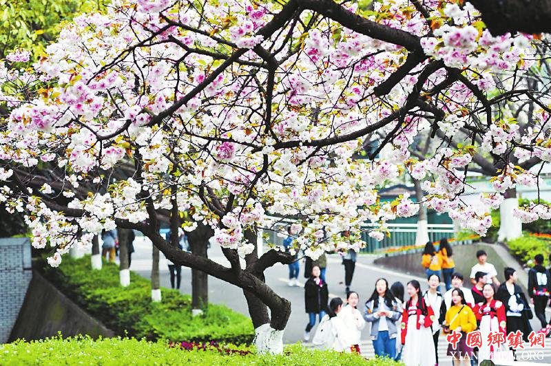 3月29日,绵阳实验高级中学内,校园里盛开的樱花吸引孩子们流连花下。王勇摄(视觉四川)