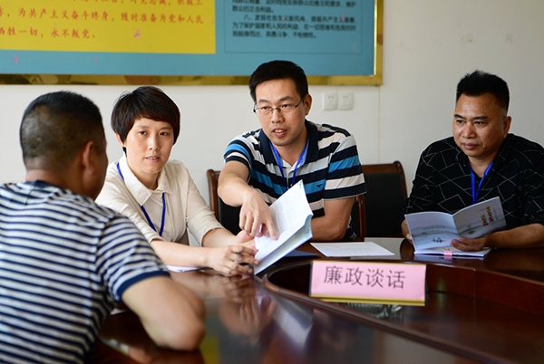 5月8日,宁德市古田县纪委监委干部同浣下村村委委员(左一)进行廉政谈话。