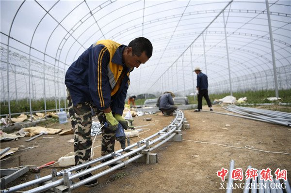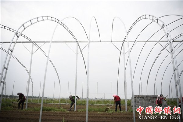 在固原市原州区彭堡镇姚磨村,村民在蔬菜基地搭建日光温室(8月27日摄)