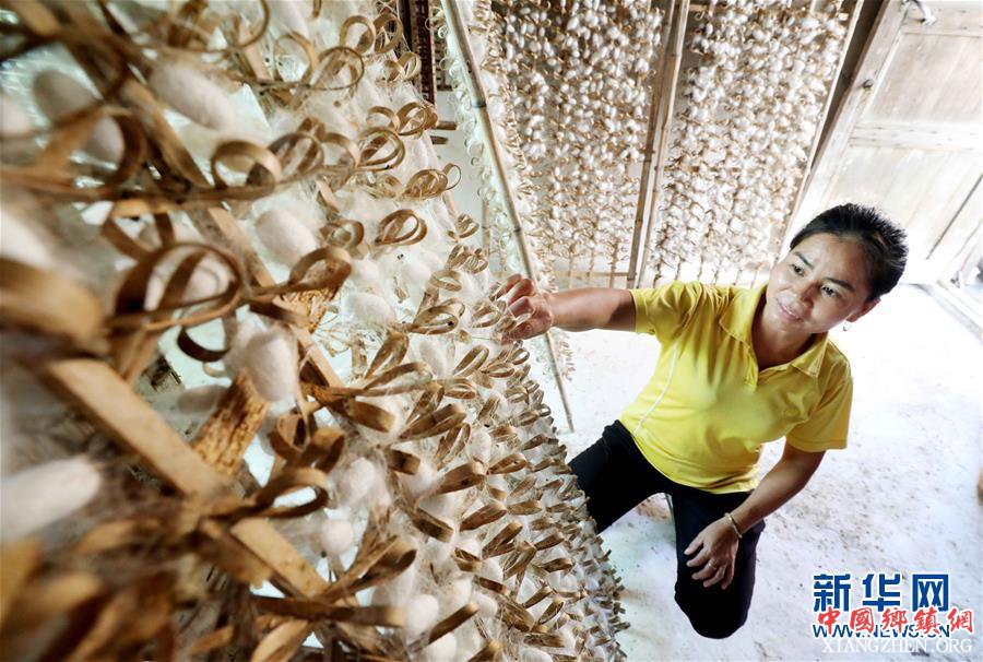 在广西柳州市融安县浮石镇隘口村,蚕农石洁芳在查看蚕结茧情况(9月19日摄)。