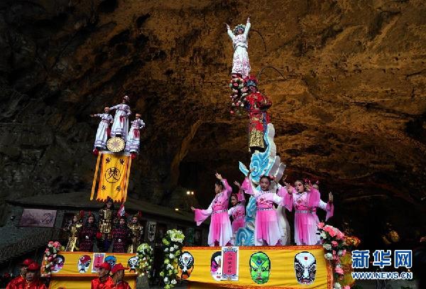 10月14日,表演者在兴文石海世界地质公园的溶洞内表演国家级非物质文化遗产“大坝高装”。