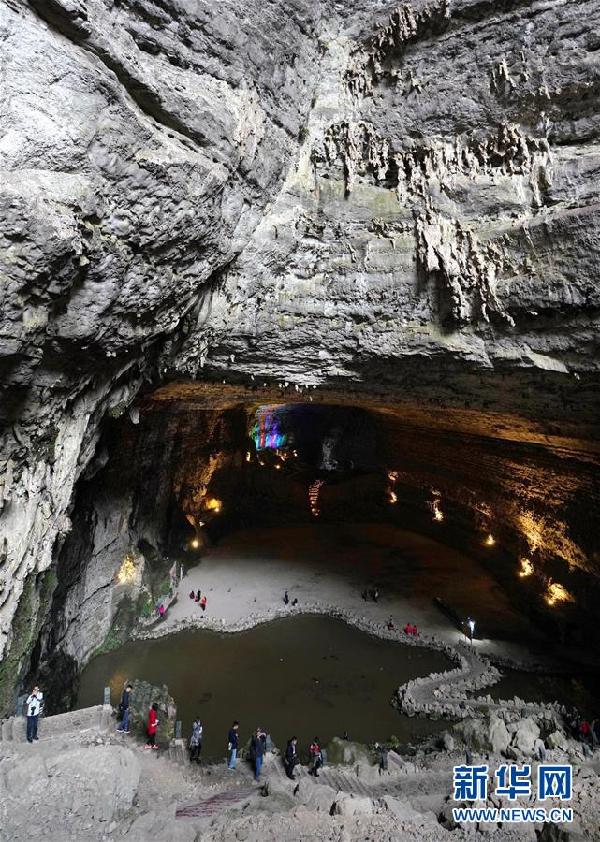 10月14日,游客在兴文石海世界地质公园的地下溶洞参观。