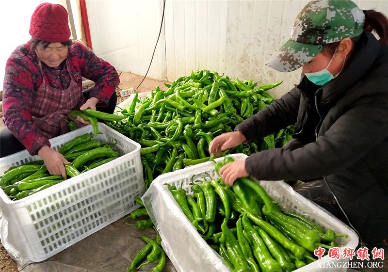 在郯城县马头镇栋杰蔬菜基地的日光温室大棚内,菜农仔细地排列收获的辣椒,准备装箱外运。