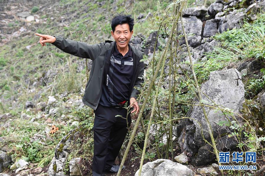 云南西畴县西洒镇么洒村的程敦儒在介绍石漠化山地里种植的中药材(4月16日摄)。新华社记者 杨宗友 摄