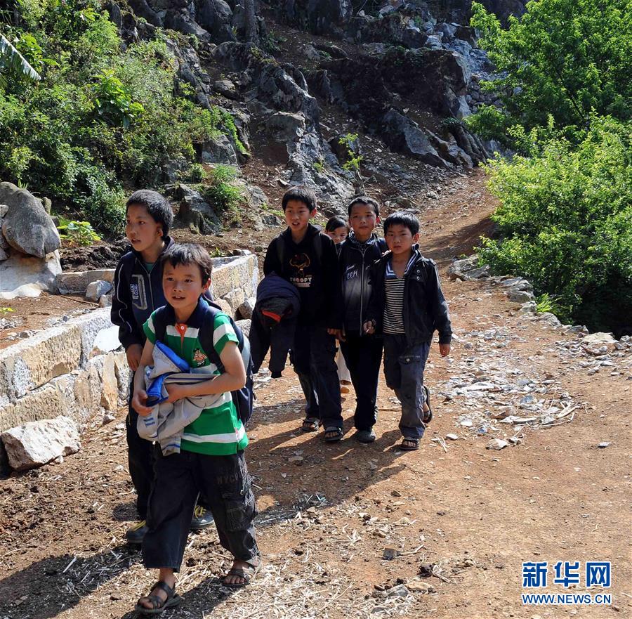 云南西畴县鸡街乡肖家塘村的孩子行走在上学路上(2012年4月23日摄)。 新华社记者 杨宗友 摄
