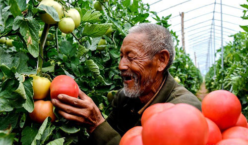7月9日,在河北涉县索堡镇上温村一处“扶贫大棚”,村民在采摘西红柿。近年来,河北涉县积极创新扶贫模式,以扶贫资金为载体,吸引多种资金参与,开发建设农业基地,建立起集育苗、蔬菜种植于一体的“扶贫大棚”。贫困户在领取“分红”的同时又可以在农业基地打工挣工资,实现双丰收。新华社记者 王晓 摄