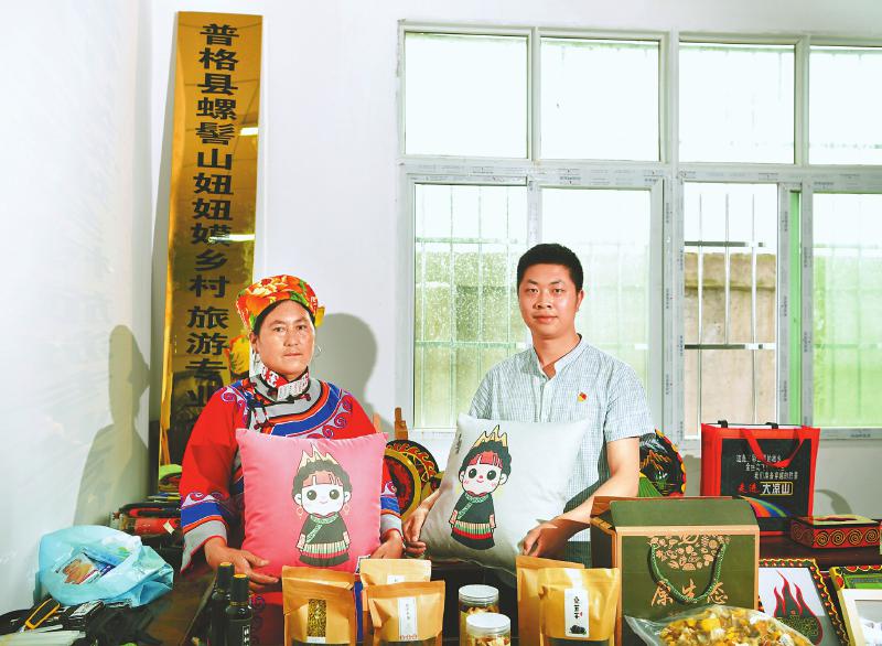 在凉山州普格县螺髻山镇德育村的电商产品展览室里,螺髻山镇综合帮扶工作队队长唐举帅(右)展示新设计的文创抱枕。