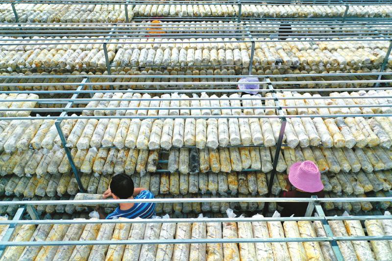 在甘孜州雅江县松茸产业园一家松茸企业“扶贫车间”,当地村民正在开菌袋,以便出菇。