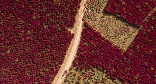 9月23日,山西省柳林县贾家垣乡曹家沟村村民在收割扫帚草(无人机拍摄)。 曹家沟村是山西省柳林县一个贫穷村庄。2016年,柳林县环卫中心扶贫工作队指导在曹家沟村发展扫帚草种植,在扶贫工作队的带动下,村民纷纷加入扫帚加工合作社。2019年,曹家沟村种植扫帚草270亩,预计产量可达到14万株左右,产值超过80万元。短短几年,曹家沟村村民人均年收入从2000多元增加到5000多元。 新华社发 (刘亮亮 摄)