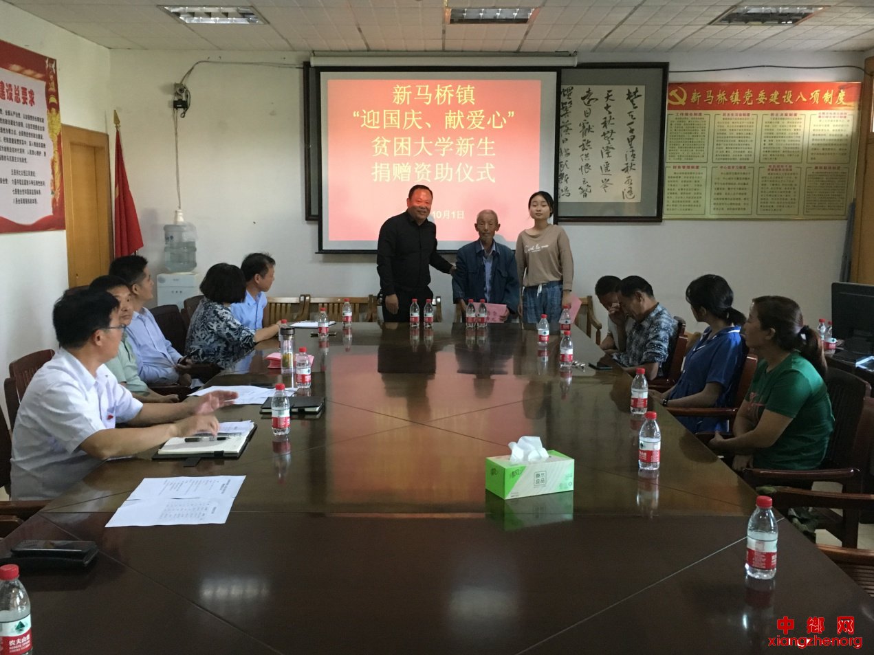 中乡网安徽讯 在庆祝中华人民共和国成立70周年之际,10月1日下午,新马桥镇组织开展了“迎国庆、献爱心”贫困大学新生捐赠资助活动,镇党委、政府、人大主要负责同志,新马桥商会部分代表,10名受资助贫困大学新生或家长,所在村居扶贫工作队长、党组织书记参加了活动。