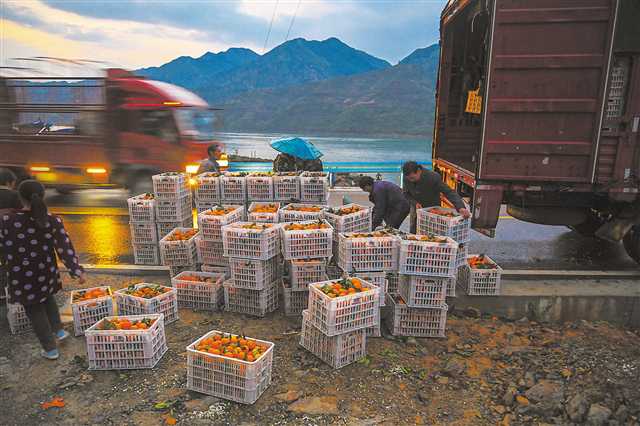 四月九日,奉节县安坪镇三沱村,来自河南的水果商正在将采购的脐橙装车发运。