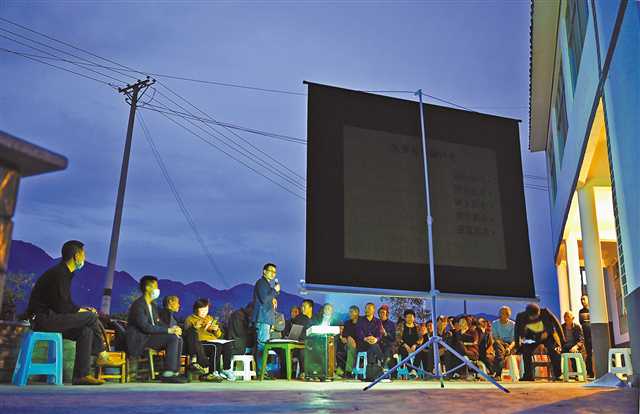 四月九日,三沱村村民参加村里的院坝会,商讨致富计划。