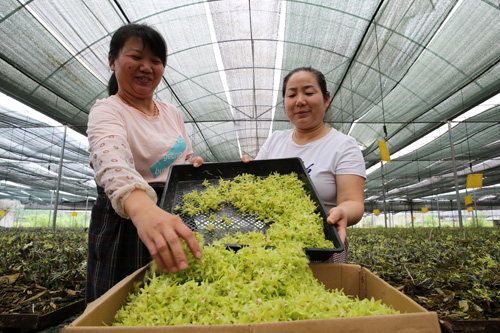 四川新闻网内江5月28日讯(兰自涛 文/图)5月26日,在四川省内江市东兴区田家镇千草中医药康养文化村,村民正在采摘铁皮石斛鲜花。