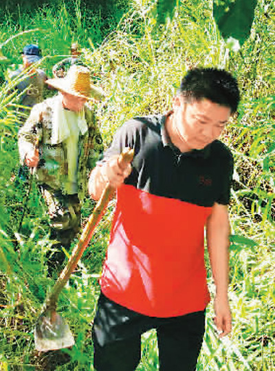 来承金(前)和村民走在山路上。 |