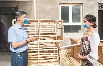 杨明(左)在村里的木材加工合作社与贫困户交流。 |