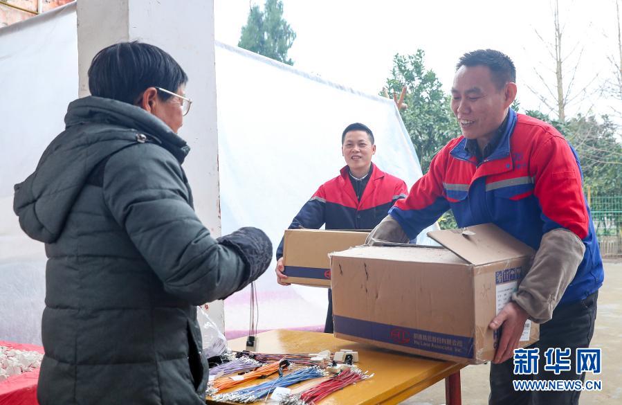 1月10日,华蓥市一企业工作人员给明月镇三合团村“农家微车间”配送原材料。