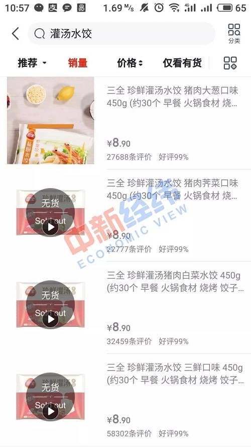 与此同时,各大电商平台销售的“三全灌汤水饺”也已悄然下架,在三全食品天猫和京东官方旗舰店内,中新经纬客户端并未发现涉事的同款“三全灌汤水饺”。在京东平台上,三全食品多款灌汤类水饺也显示“无货”。