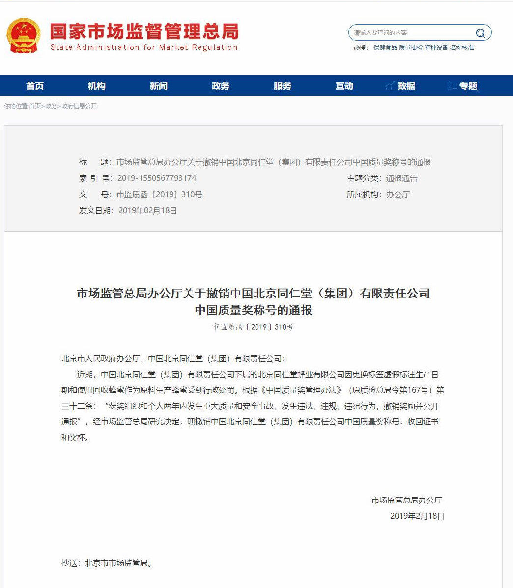 人民网北京2月19日电 据国家市场监督管理总局官网网站消息,市场监管总局办公厅关于撤销中国北京同仁堂(集团)有限责任公司中国质量奖称号的通报: