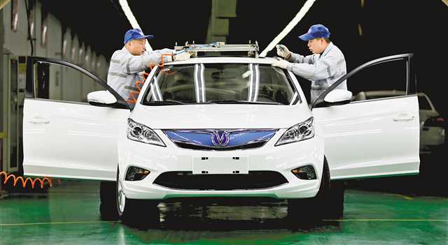 长安汽车技术人员正在生产车间对下线的新能源汽车进行检测。(本报资料图片)