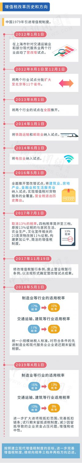 在降低税率方面,适用16%税率的项目改按13%税率征税,主要涉及制造业等行业;适用10%税率的项目改按9%税率征税,主要涉及交通运输业、邮政业、建筑业、房地产业、基础电信服务和农产品等货物。