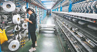 浙江省诸暨市安华镇工业园区的锦事达化纤有限公司数字化车间内,工作人员正在操作自动化生产设备。 |