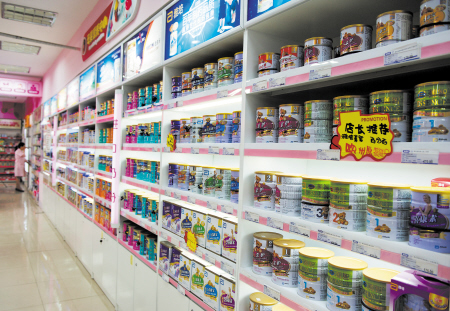 某婴孕品店的货架上摆满了各种国产、进口奶粉。 邹麟 摄