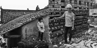 左图:在陕西省安康市石转镇,4岁的杨文璇站在村里的一处老屋旁;右图:在辽宁省朝阳市一建筑工地打工的父亲站在一处木料堆旁。新华社记者 刘杰摄