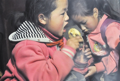 炭火中烧熟的土豆就是早餐,孩子们在津津有味地吃土豆。吃完之后,将要去学校。