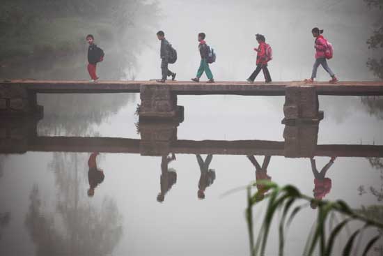 重庆市大足区龙岗街道明星村,小学生正走过一座石板桥去学校上学。CFP供图(资料图片)