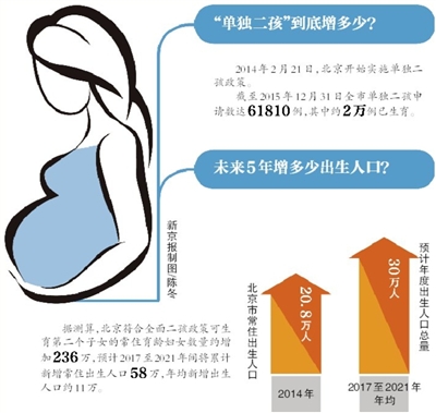 此前,2014年2月,北京市曾实施单独二孩政策。根据市卫计委统计数据,截至2015年12月31日全市单独二孩申请数达61810例,其中约2万例已生育。如果根据申请数推算,仍有约4万例需要释放。加上“全面二孩”加码的生育数量,未来,北京市新生儿是否会面临“井喷式”增长?