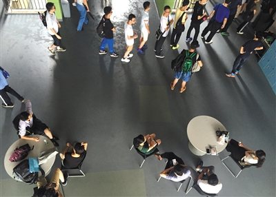 新京报记者注意到,一般的高校里贴满了公务员招考培训、英语四六级培训广告海报,而南方科技大学仅有的广告就是学生食堂里的留学广告海报。
