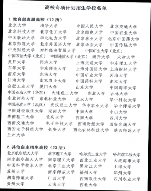 2017年高考高校专项计划招生学校名单。据省教育厅