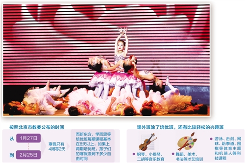 查看2018年日历,明年的寒假并不长。按照北京市教委公布的时间,从1月27日到2月25日,寒假只有4周零2天。而新东方、学而思等培优班每期课程基本在8天以上,如果上两期培优班,再加上过年,孩子们的寒假没剩下多少自由时间了。