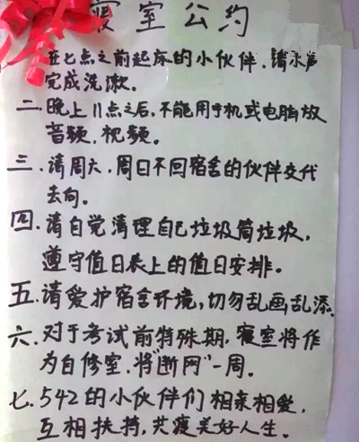 图为该宿舍入学时制定的宿舍公约。受访者供图