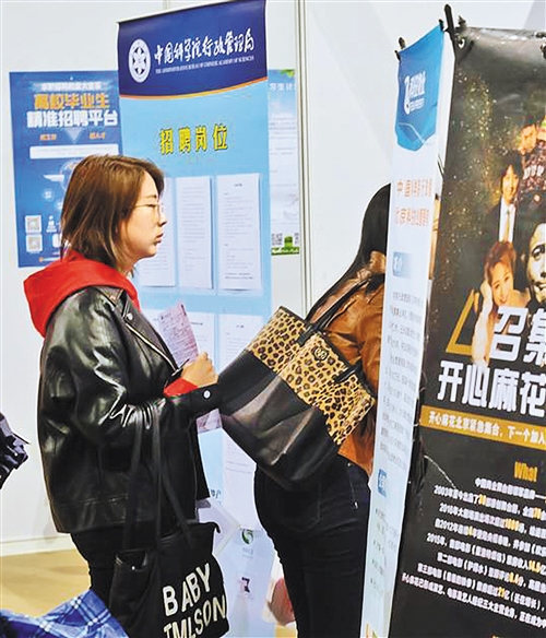 在招聘会现场,身着正装的周源走走转转,仔细阅读着用人单位的招聘海报。作为一名中文系硕士应届毕业生,周源手里已经有了好几份录取通知书,她仍然显得有点焦虑。还有2个多月就要毕业了,是回老家沈阳还是留在北京,她坦言还没有想好。回到老家离父母更近一些,在大城市里发展机会更多,究竟如何取舍,她迟迟做不出决定。