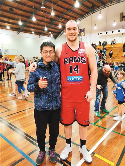图为吴宇森在新西兰球馆观看篮球赛时和球员合影留念。
