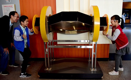 10月7日,小朋友和家长在郑州科技馆里体验“翻转的镜像”。“十一”假期,许多小朋友走进郑州科技馆,体验形式多样的科普活动,学习科技知识。朱祥/摄