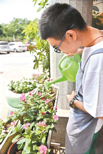 四人中,戴着眼镜的是店里唯一的自闭症患儿涛涛。今年21岁的他,在喜糖已经工作了14个月,算是店里的“老员工”了。每天早上8时,涛涛来到店里的第一件事就是给店门口的绿植浇花。他贴心细致的样子,仿佛照顾小朋友一样。“我最中意的就是淋花,店里的花每天都是我淋的。”涛涛自豪地说。事实上,几盆绿植和鲜花在涛涛的照料下也长势喜人。停顿半晌之后,他想了想,又说多一句“多谢买我们的糖水,支持我们就业。”一时间引来大家捧腹。店面负责人喜糖糖主文湘告诉记者,涛涛十分敬业,在店里工作14个月,每天8时准时到店,刮风下雨没有一天迟到过。